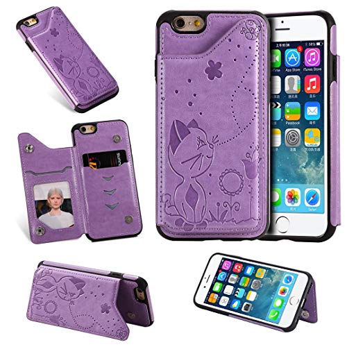 SATURCASE Case for Apple iPhone 6 6S, Cat Bee Embossing PU Leather Flip TPU Magnetic Buckle Wallet Stand Card Slots Protective Cover for Apple iPhone 6 6S (Purple)