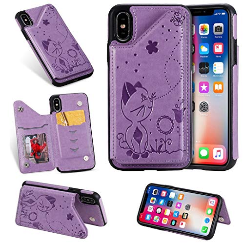 SATURCASE Case for Apple iPhone X/XS, Cat Bee Embossing PU Leather Flip TPU Magnetic Buckle Wallet Stand Card Slots Protective Cover for Apple iPhone X/XS (Purple)