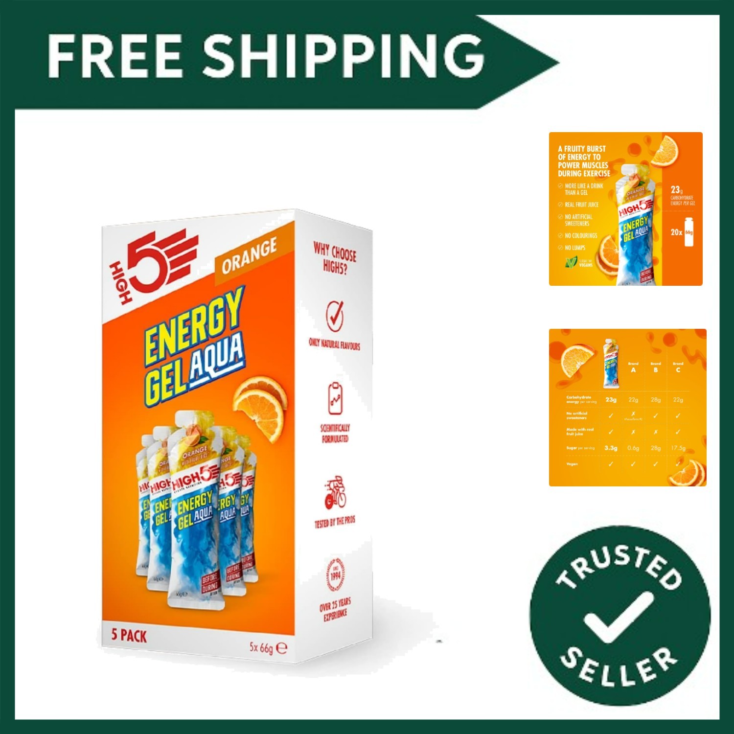HIGH5 Aqua Running Gels Energy - Running Essentials for Quick Release Energy - Natural Fruit Juice & No-Caffeine - Ideal as Running Equipment, Cycling Supplements, Marathon Training (Orange, 20 x 66g)