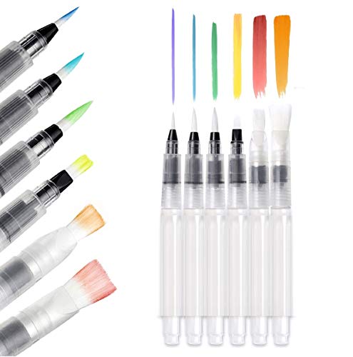 Water Brush Pens Aqua Pen Brushes Refillable Aquash Paintbrush with Water Reservoir Watercolour Paints Water Soluble Pencils Aqua Flow Markers Wash Painting Blending (6 Assorted Tips Set - 1 Set)