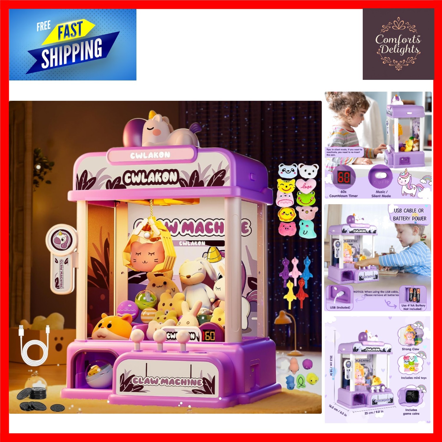 Children’s Cute Animal Claw Machine with Dolls and Capsules, Large Claw Machine, Doll Grabber Machine, Electronic Arcade Game Console with Sound & Coins, Mini Doll Grabber for Boys Girls (Purple)