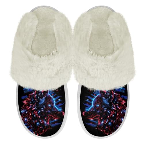Binienty Star Wolf Print Arctic-Ready Thermal Fuzzy Slippers Unisex Men Women House Slippers Cozy Home Indoor Outdoor Bedroom Shoes, Size 5.5-6.5