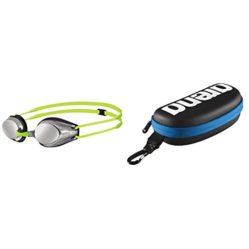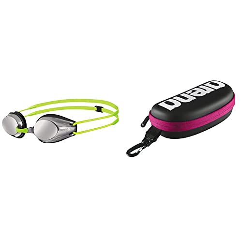 Arena Tracks Junior Children's Unisex Competition Swimming Goggles Mirrored, Silver/Black/Fluo Yellow & Unisex Goggles Case (Hard Shell, Carabiner), Black White Fuchsia