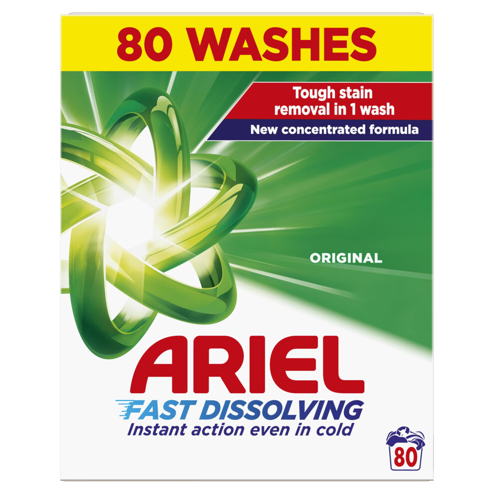 Ariel Fast Dissolving Washing Powder Laundry Detergent 4kg, 80 Washes, Original, Tough Stain Removal In 1 Wash, Instant Action Even In Cold