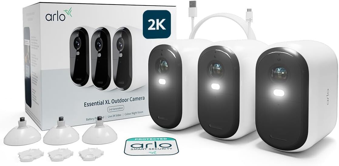 Arlo Essential 2K XL Video Security Camera Outdoor Wireless, XL Battery Operated Home Camera With Colour Night Vision, Light, Siren, 2 Way Audio & WiFi, Arlo Secure Free Trial, 3 Cameras, White