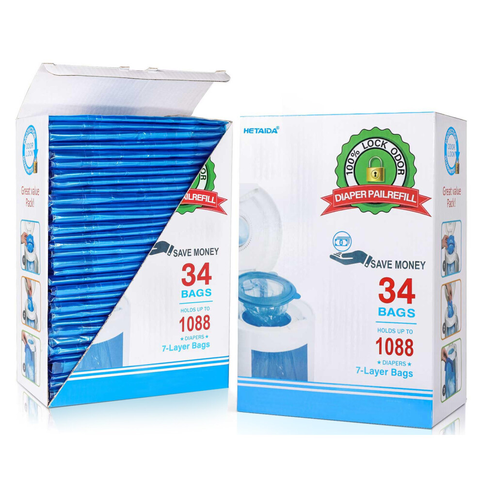 Diaper Pail Refill Bags 34 Bags 1088 Counts Compatible with Arm&Hammer Disposal System, 100% Lock Odor, Seal and Toss Diaper Pail Refills