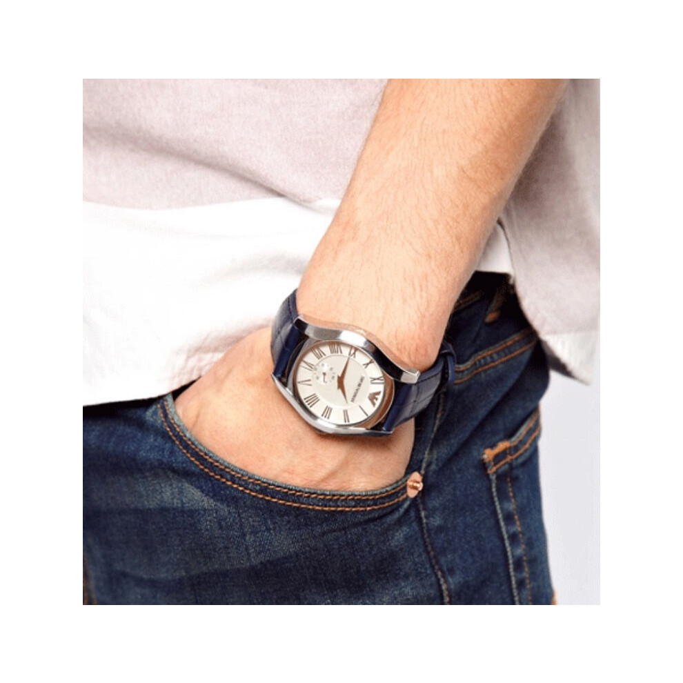 Armani Men's Watch AR1666 Blue Leather Strap Silver Dial Silver Case