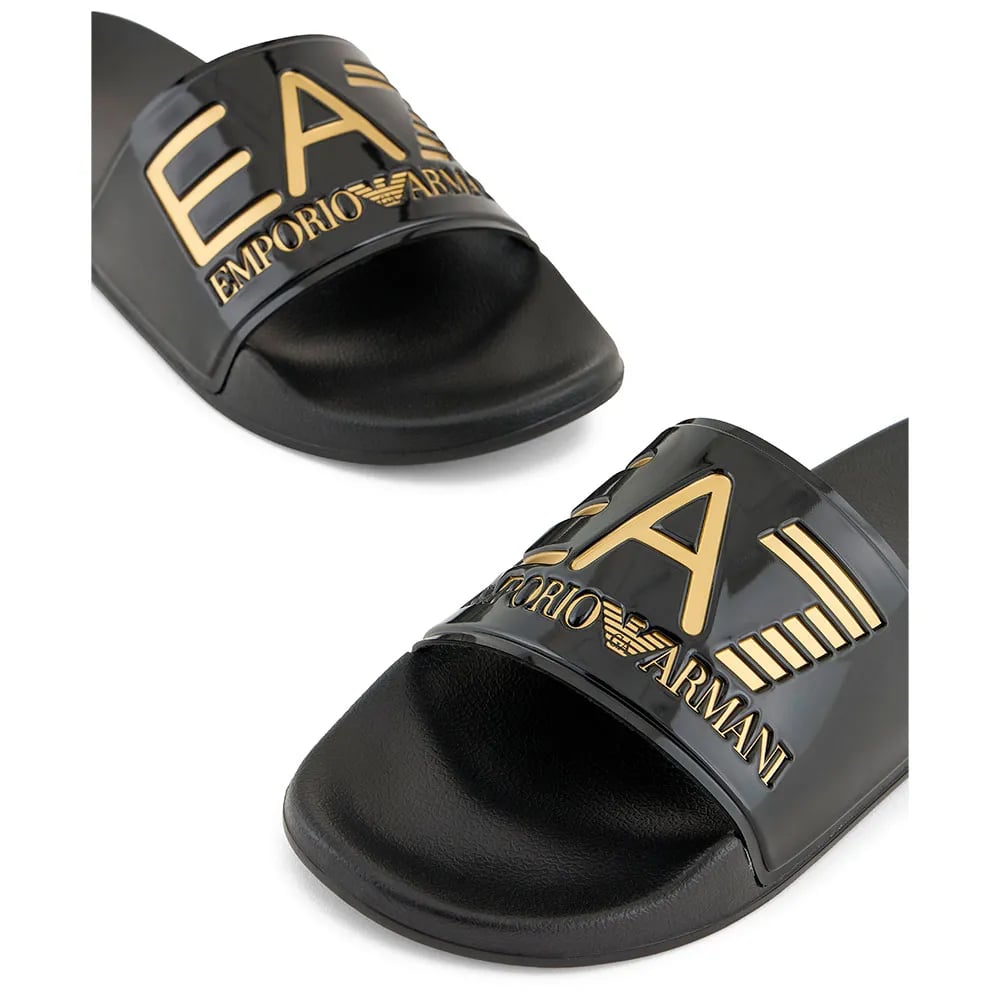 EA7 Emporio Armani Visibility Logo Slides Shiny Black/Gold (Black/Gold, UK Footwear Size System, Adult, Men, Numeric, Medium, 8)