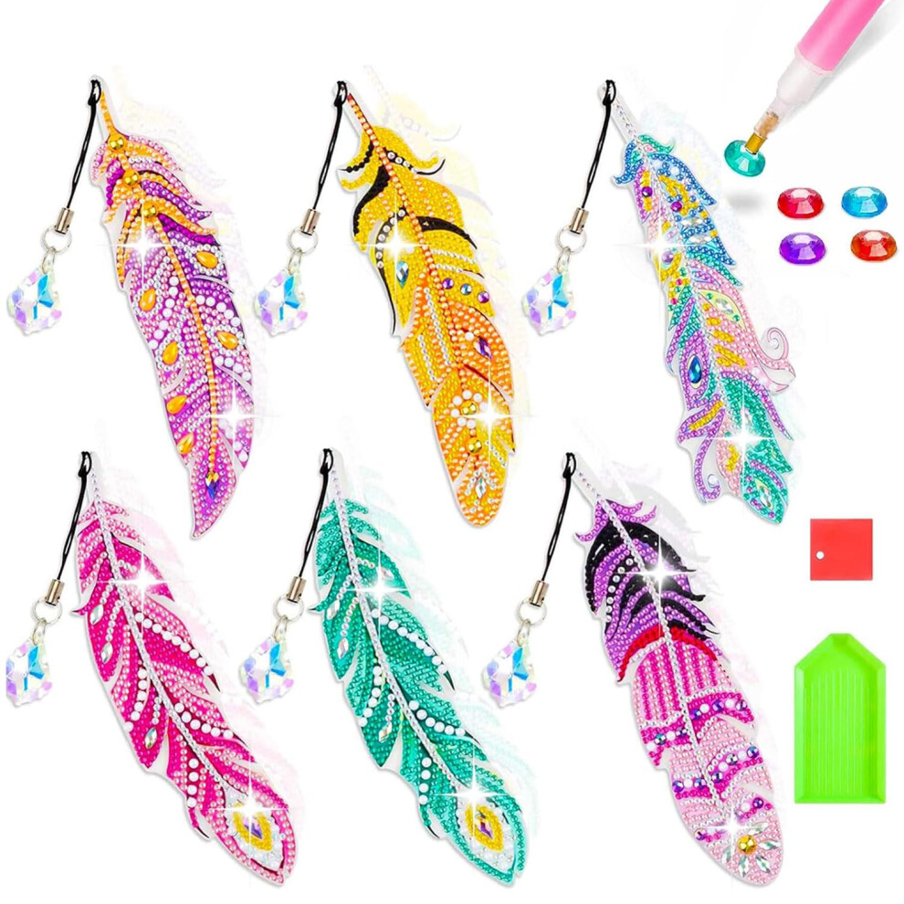 Diamond Painting Bookmarks 6 Pcs, Art and Craft Kits for Kids Age 7 8 9 10, 5D DIY Diamond Art Bookmarks Feather Shape Rhinestone with Crystal Pendant