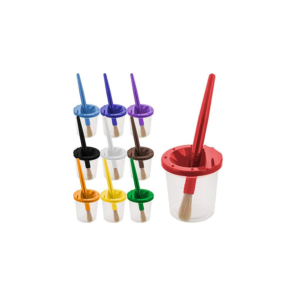U.S. Art Supply 10 Piece Childrens No Spill Paint Cups with Colored Lids and 10 Piece Large Round Brush Set with Plastic Handles