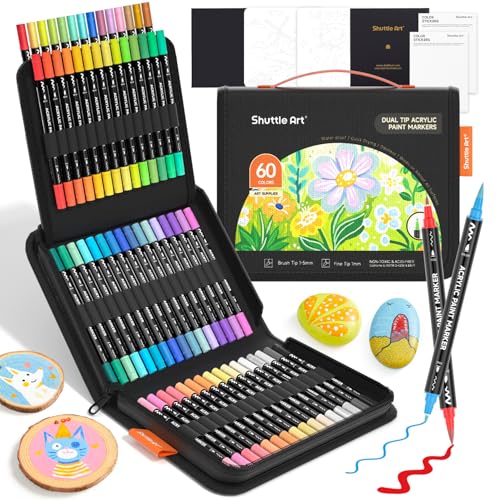 Shuttle Art Dual Tip Acrylic Paint Pens, 60 Colours Fine & Brush Paint Marker Pens, Paint Pens for Rock Painting, Ceramic, Wood, Fabric, Glass, Art Marker Pen Set for Kids Adults on Christmas Easter