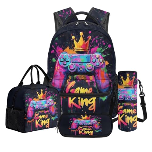 QOPECUOY 4 in 1 Kids School Backpack Sets Art Gamer Schoolbag for Teen Boys Girls Game King Print Bookbag with Lunch Box Pencil Pouch Water Bottle Holder for Elementary Children Back to School Bag
