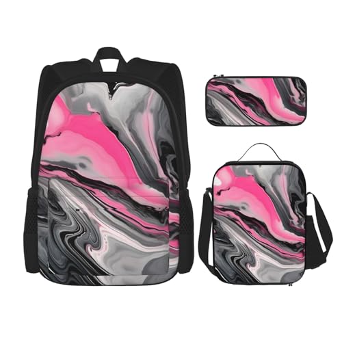 YIJIAYUN 3Pcs School Essentials Pink Abstract Marble Gray Artistic Print Set for Students:School Bag+Pencil case+Lunch Bag Combination