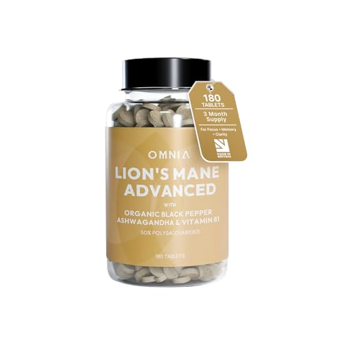 OMNIA Lion’s Mane 2000mg Tablets –15:1 High Strength Extract –with Ashwagandha, Organic Black Pepper & Vitamin B1 –180 Vegan Tablets –UK Made Brain Supplement for Focus & Clarity
