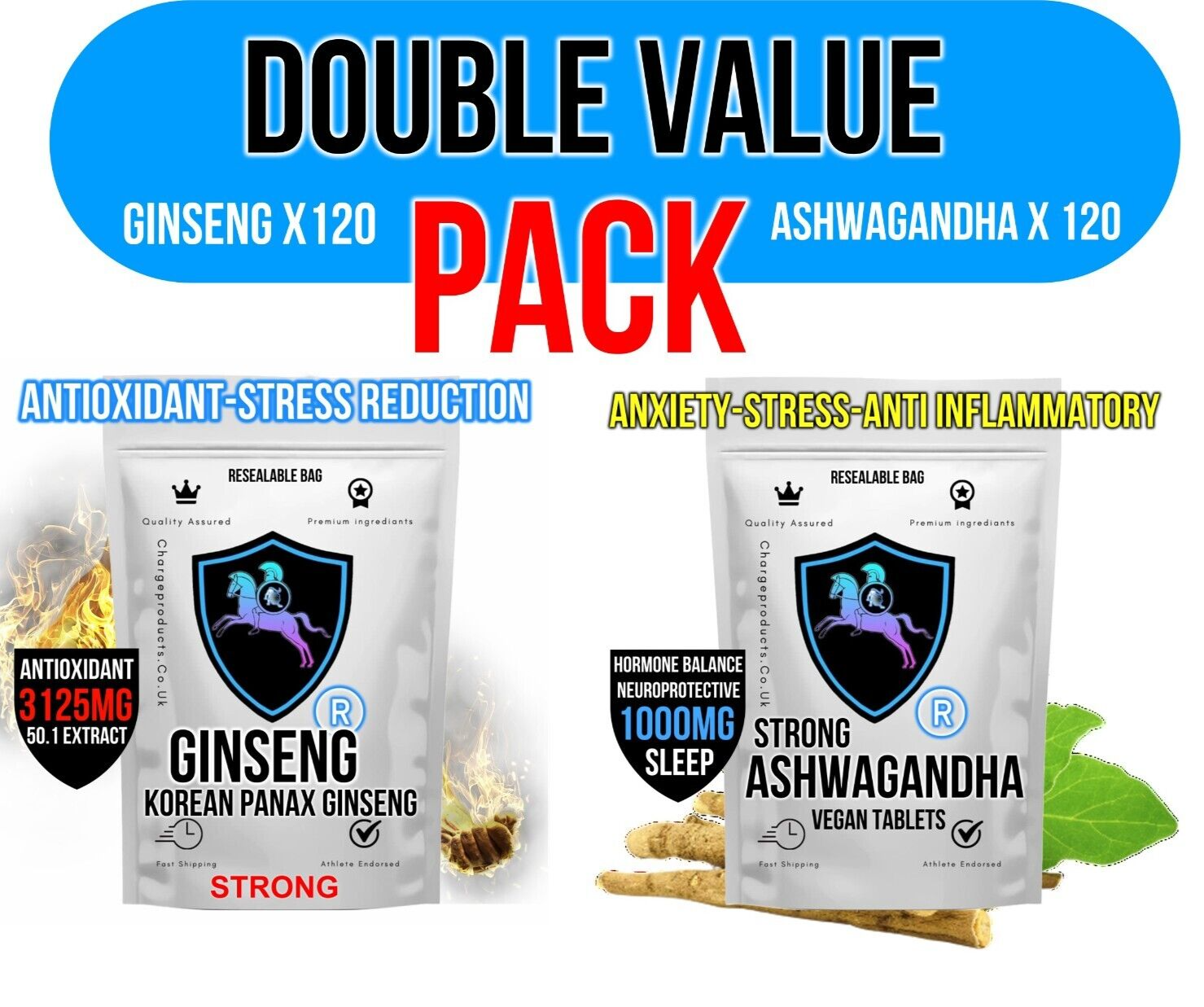 DOUBLE PACK Korean Ginseng 3125mg 2x 120 Tablets Plus Ashwagandha Extract 1000mg