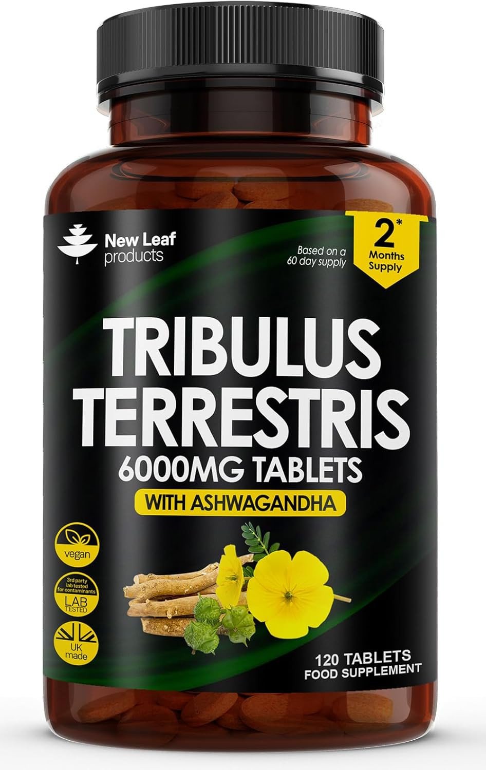Tribulus Terrestris 6000mg High Strength Tablets Enriched with Ashwagandha - 95% Sapopins - 120 Tribulus Terrestris Tablets Made in The UK by New Leaf