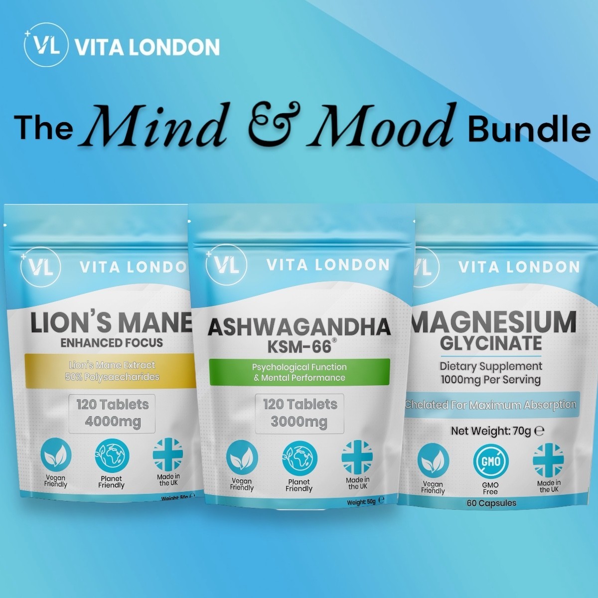 Mind Mood Set - Magnesium Glycinate Capsules + Lions Mane + Ashwagandha Tablets