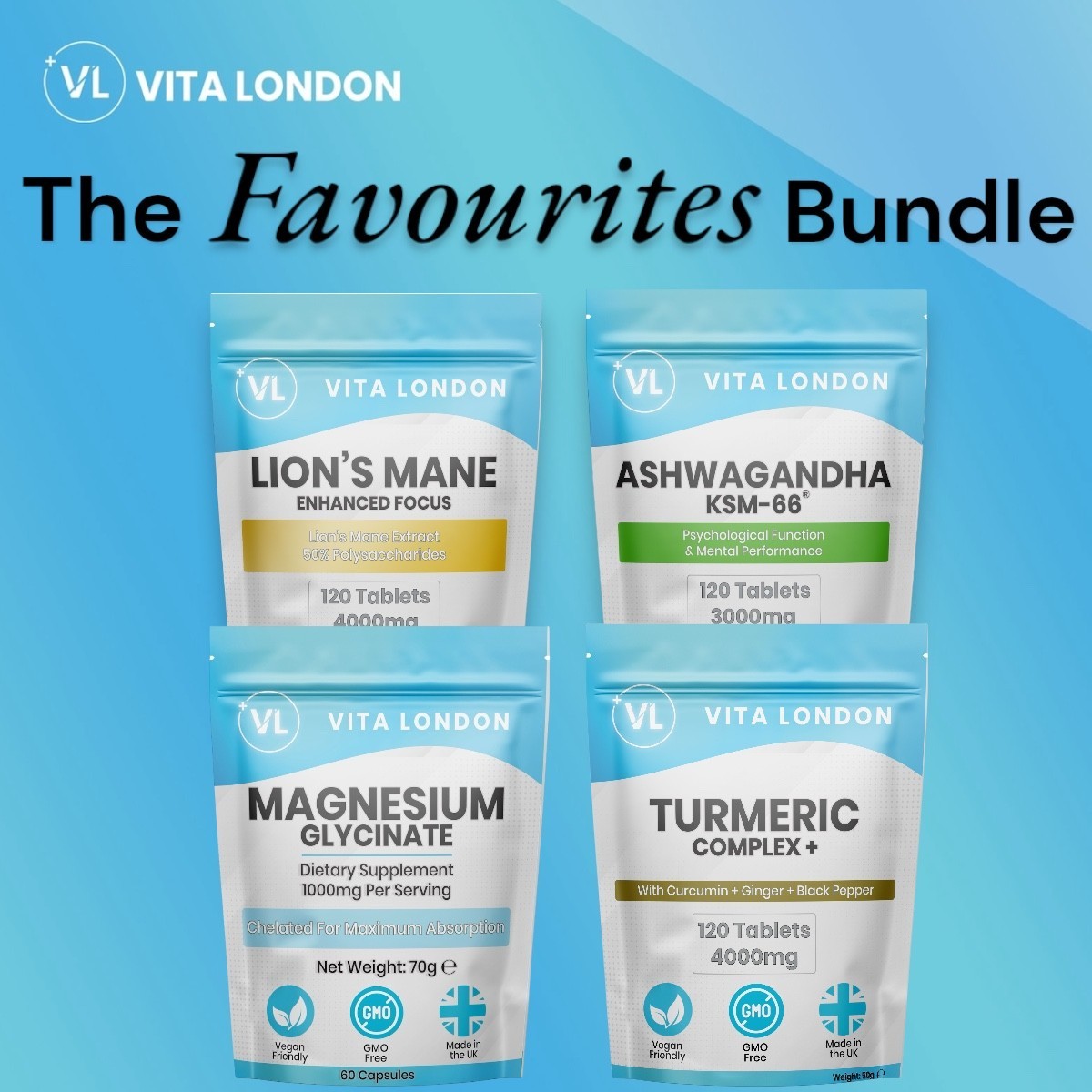 4pk - Magnesium Glycinate + Lions Mane + Turmeric + Ashwagandha Tablets Capsules