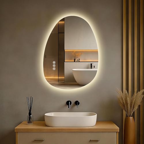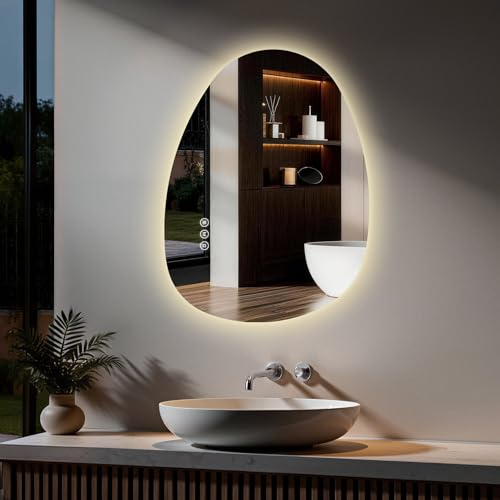 LIMENQIN Irregular Bathroom Mirror, Asymmetrical Frameless Wall Mirror, Decorative Makeup Vanity Mirror, Dual Touch Switch, 3 Colors Dimmable and Anti-Fog(50x70cm/19.6x27.5in)