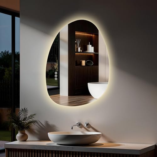 LIMENQIN Irregular Bathroom Mirror, Asymmetrical Frameless Wall Mirror, Decorative Makeup Vanity Mirror, Dual Touch Switch, 3 Colors Dimmable and Anti-Fog(60x80cm/23.6x31.5in)