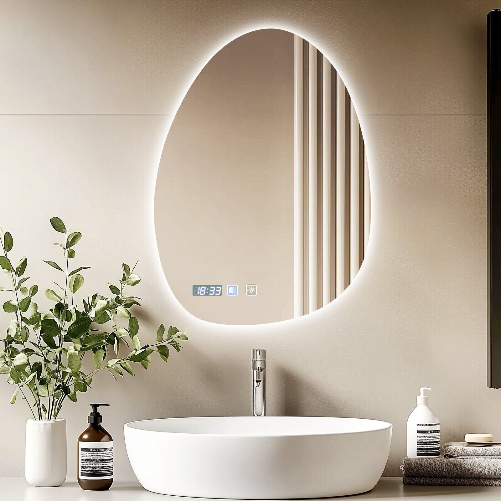 EMKE Asymmetrical Bathroom Mirror with LED Lights 60 x 45 cm, Irregular Smart Demister Pad, 3 Colours Dimmable, Touch Switch Memory Function Lead