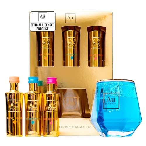 Au Vodka Gift Set - Blue Raspberry, Juicy Peach & Pink Lemonade Flavoured Vodka 5cl Minis & Diamond Cut Gold Glass - Official Licensed - Christmas, Birthday Gifts for Men and Women - Alcohol Gift Set