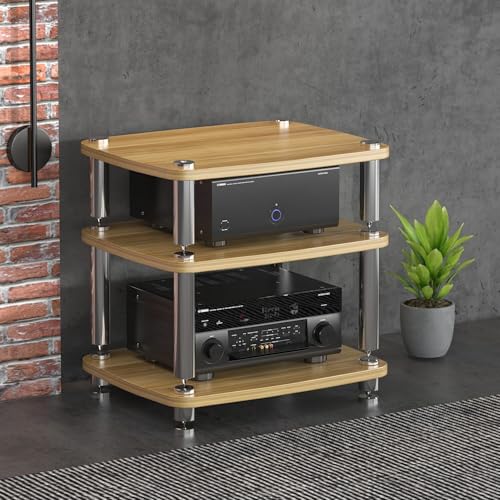 Diodceraic Media Stand 1/2/3/4-Tier Video Audio Rack Solid Wood Columns & Anti-Vibration Metal Feet Entertainment Stand,Rack Audio Tower Stereo Receiver, Turntable & AV Equipment(Natural,3 tier)