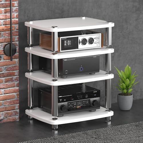 Diodceraic Media Stand 1/2/3/4-Tier Video Audio Rack Solid Wood Columns & Anti-Vibration Metal Feet Entertainment Stand,Rack Audio Tower Stereo Receiver, Turntable & AV Equipment(White,4 tier)