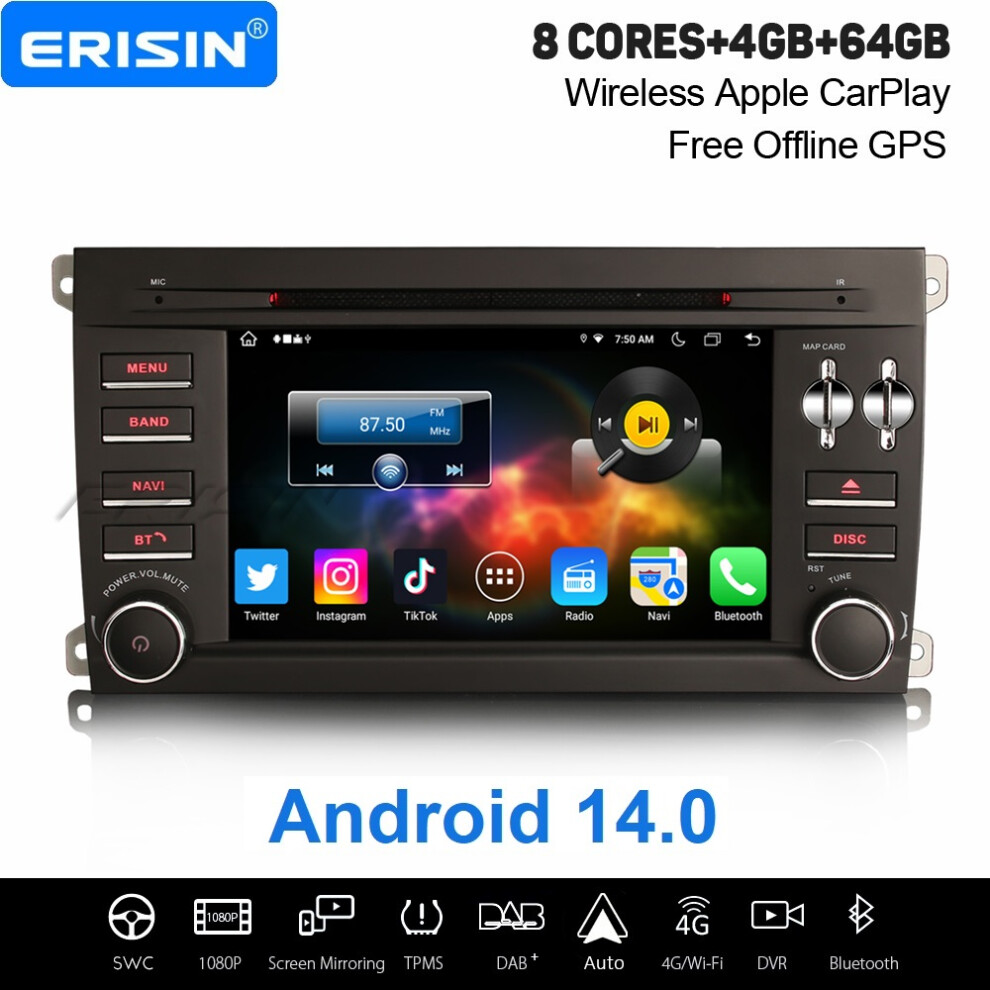 Erisin 8-Core 4GB+64GB Android 14 Car Stereo Porsche Cayenne DAB+ GPS Radio CarPlay Android Auto DVD 4G WiFi