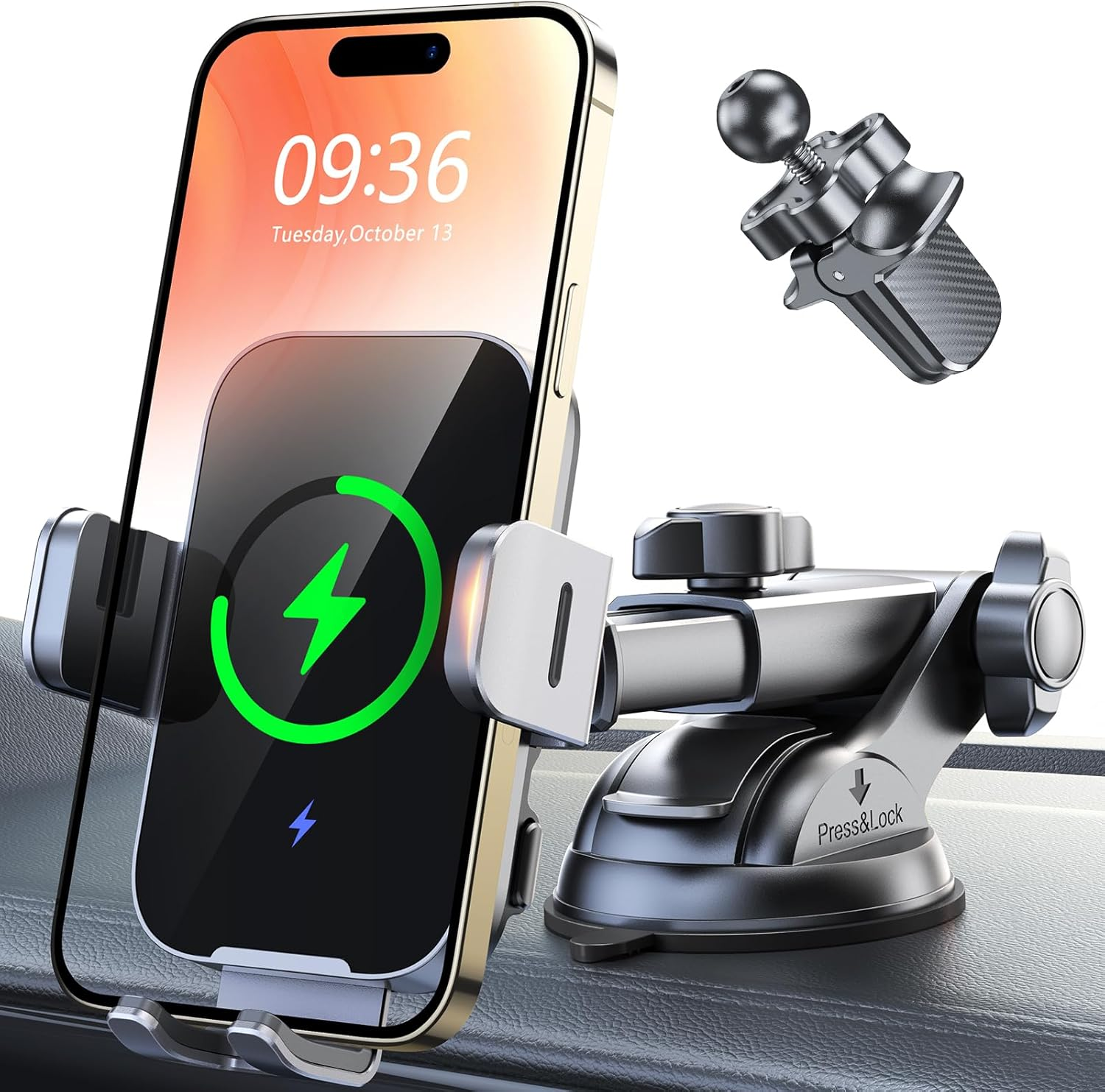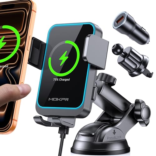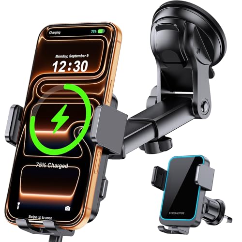 MOKPR Wireless Car Charger, 15W Fast Charging Auto Clamping Car Phone Holder Wireless Charger Suction Holder Dashboard Compatible for iPhone 17 16 15 14 13 12,Samsung Galaxy S26 S25 S24 S23 S22