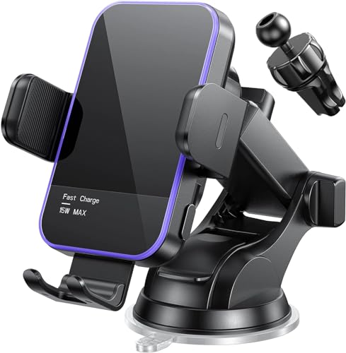 Car Phone Holder Wireless Charger,【7 Colored RGB Backlit】MOSURR 15W Auto Clamping Wireless Car Charger Mount for iPhone 16 15 14 Mini Pro Max, Samsung Galaxy S26 Ultra S25 S24+, etc