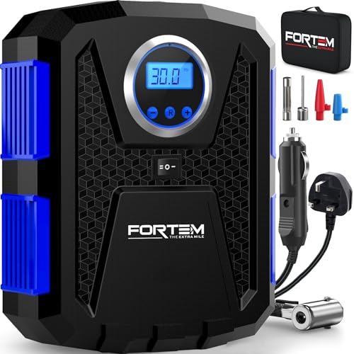 FORTEM Car Tyre Inflator 150 PSI, Air Compressor, 230V AC 12V DC Electric Air Pump for Car Tires, Digital Tire Pump w/Auto Pump/Shut Off, Carrying Case