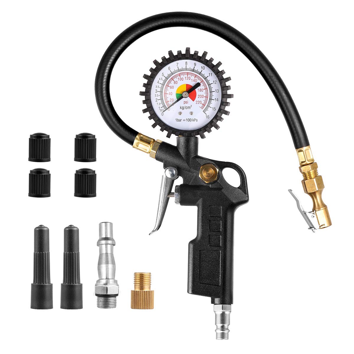 CZC AUTO Multifunction Tyre Pressure Gauge with Tyre Inflator, 220 PSI with Brass Air Chuck, Compressor Accessories with Rubber Hose & Quick Male Coupling