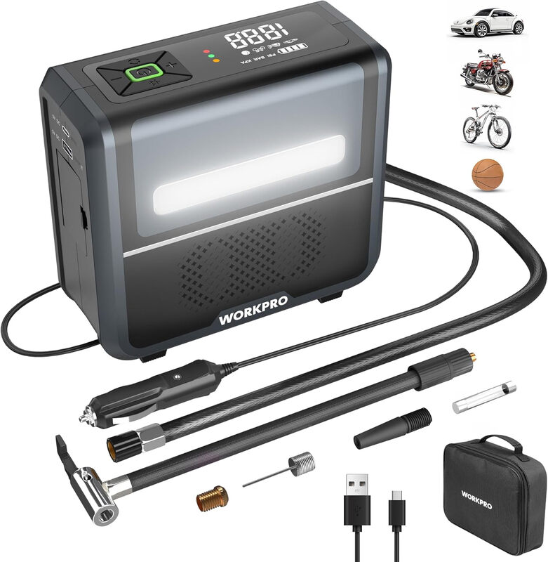WORKPRO 3-in-1 Tyre Inflator Air Compressor with LED Light, 12V Car Tyre Pump 150 PSI with Digital Display, Automatic Shut-Off & Dual Power Supply Modes, Cordless Tyre Inflator for Car, Motor, Bike