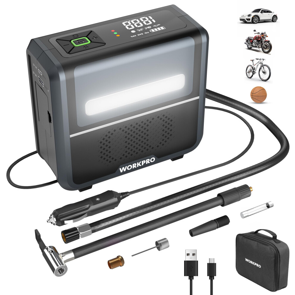 WORKPRO 3-in-1 Tyre Inflator Air Compressor with LED Light, 12V Car Tyre Pump 150 PSI with Digital Display, Automatic Shut-Off & Dual Power Supply