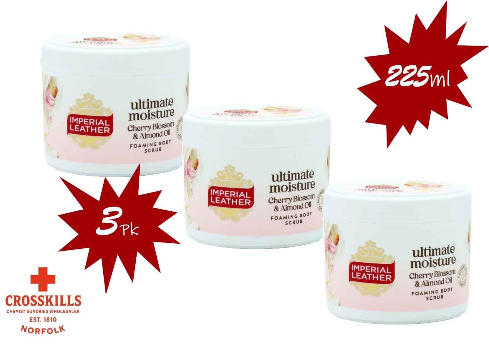 IMPERIAL LEATHER ULT MOIST BODY SCRUB - CHERRY/ALMOND - 3pk - 225ml - BRAND NEW