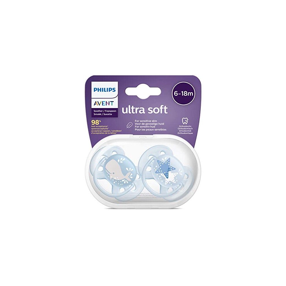 Philips Avent Ultra Soft Dummy, 2 Pack - BPA Free Pacifier for Babies from 6 to 18 Months, Whale/Star (Model SCF223/03)