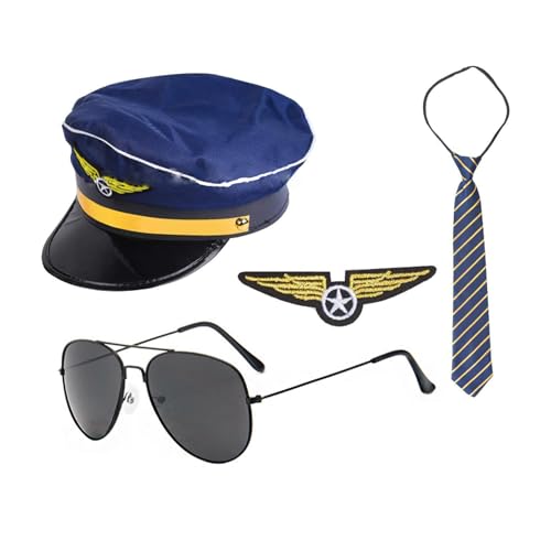 NAUZE 4 Pieces Halloween Pilot Costume Set Aviator Hat Badge Tie Glasses Airline Captain Fancy Dress Costume Accessory