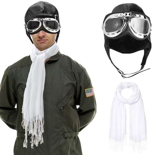 TESIN Aviator Costume - Aviator Hat with Goggles & White Scarf, Pilot Accessory Set for Halloween Cosplay, Air Force Themed Party