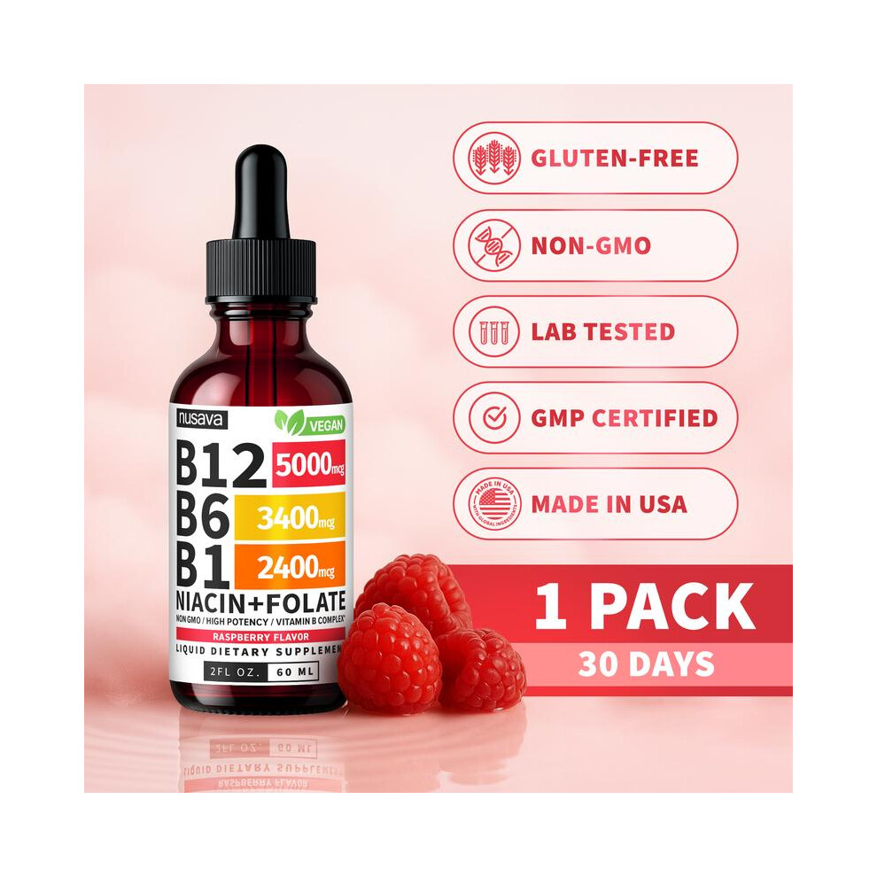 Vitamin B12 Raspberry Liquid Supplement Drops with B6, B1, Niacin & Folate - Edible Support for Energy, Brain & Heart, Non-GMO & Gluten-Free, 4 Fl Oz
