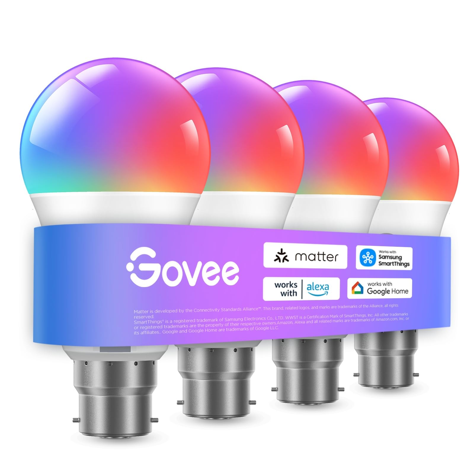 Govee RGBWW B22 Smart Bulb, Work with SmartThings, Matter, Alexa and Google Assistant, WiFi Alexa Light Bulbs B22, 9W, 800LM, Music Sync, 16 Million Colors, 54 Scenes, 4 Packs