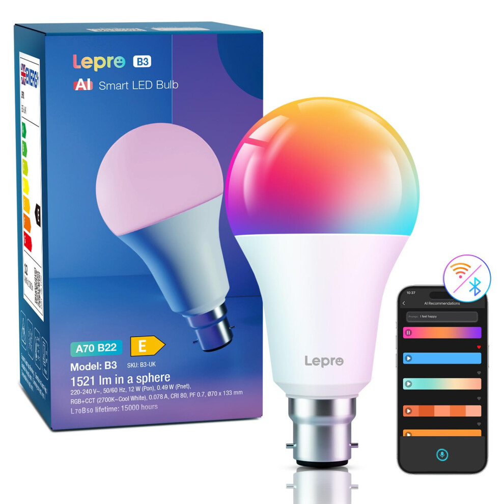 Lepro B22 AI Smart Bulb, 1521LM Smart Light Bulb, 12W, Schedule & Timer, Energy Saving, 16 Million Colors, Work with Alexa & Google Assistant,