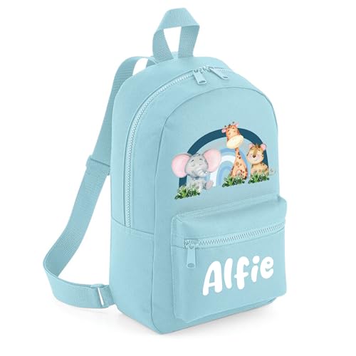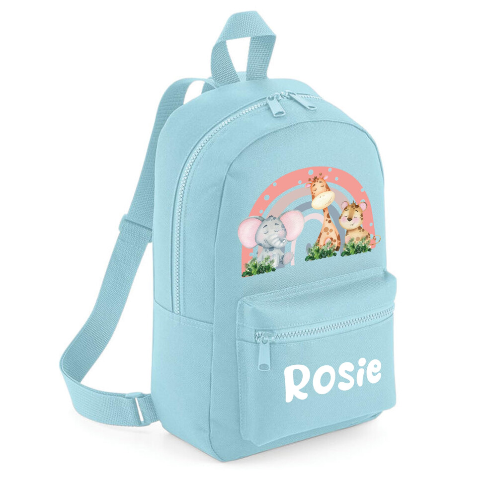 The Baby Box UK Personalised Girls Backpack Toddler Safari Rainbow Back Pack Childrens Rucksack (Light Blue)