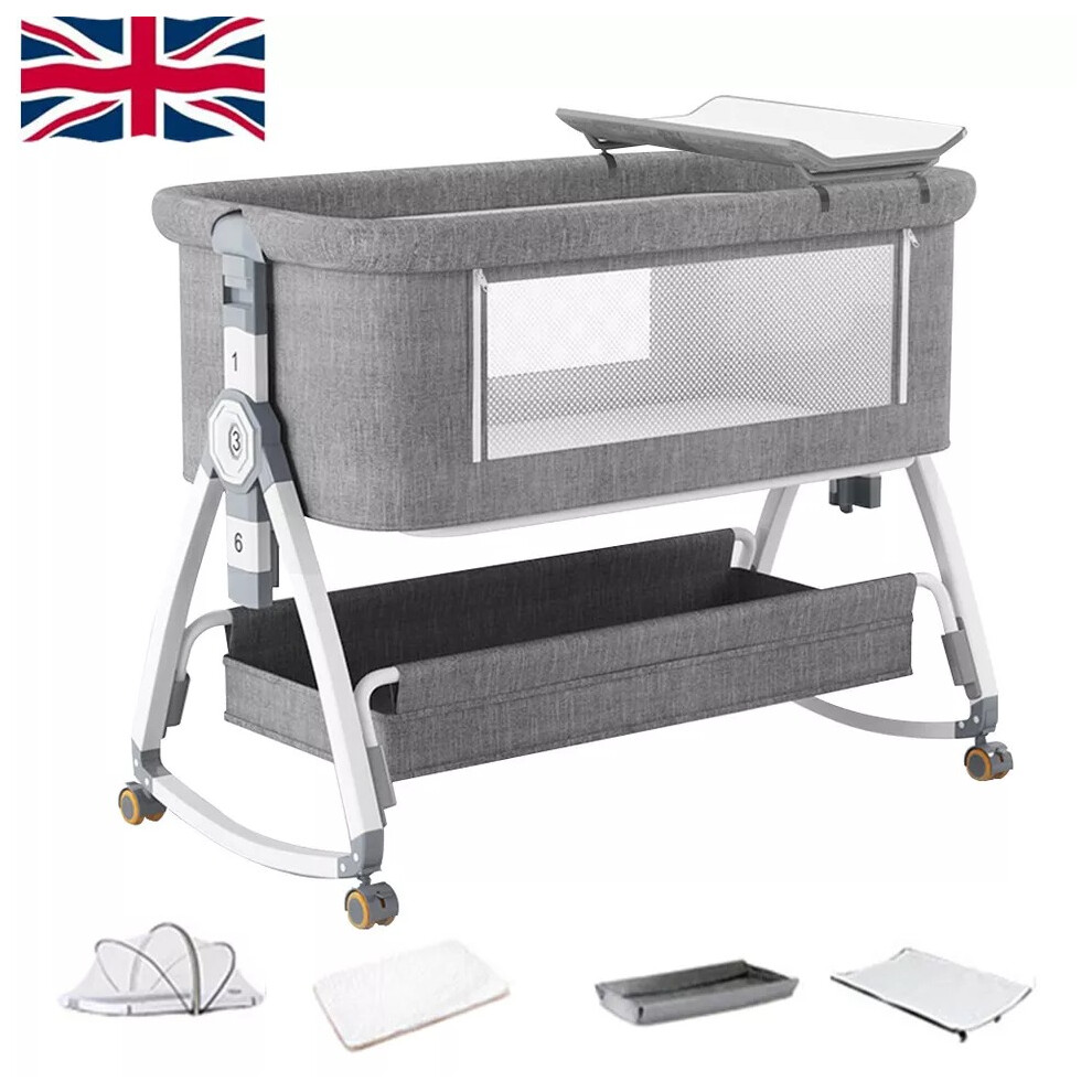 4 in 1 Baby Bedside Crib,6 Height Adjustable Next to Me Crib,Co-Sleeping Baby Cot Bed with Mattress,Detachable Net,Storage Basket & Changing Table,Can Switched to a Bassinets for 0-3 Years (Gray)