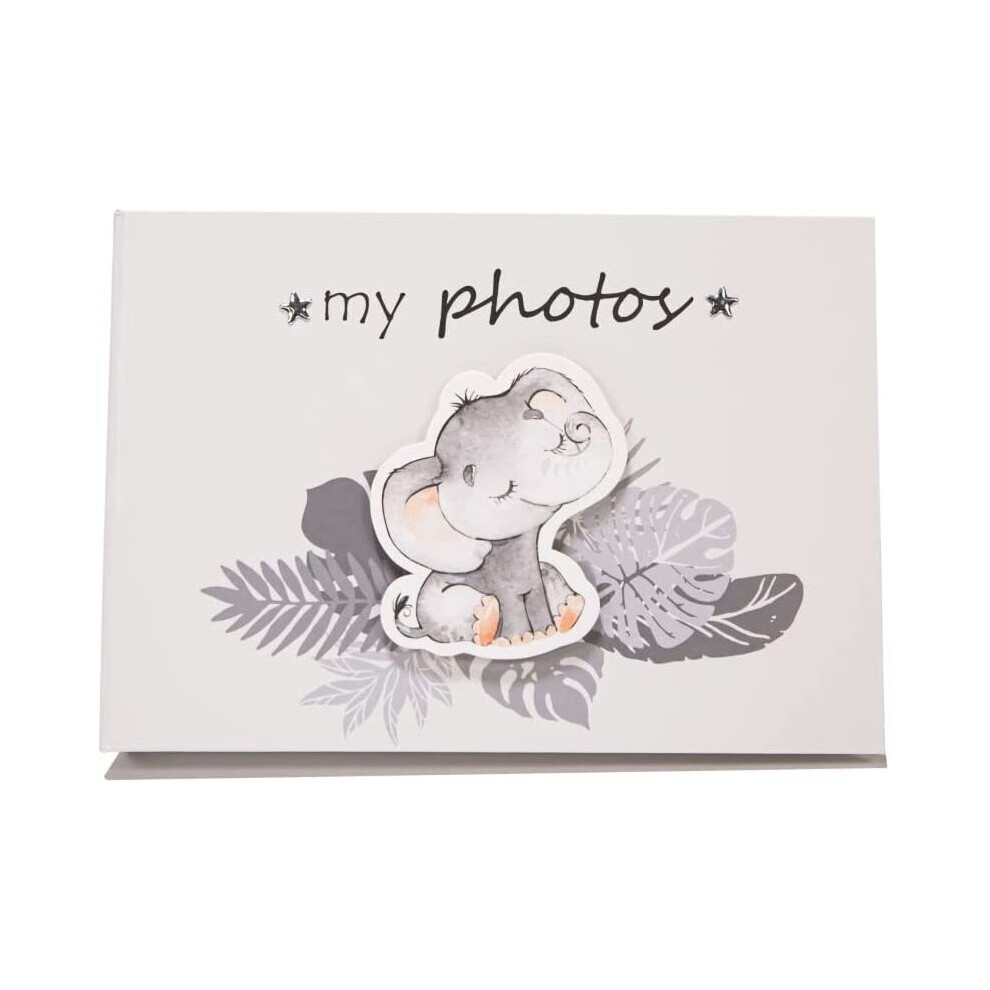 Happy Homewares Cute Baby Elephant Grey Photo Album with Silver Stars and Palm Leaves | New Born Baby 24 Spaces - 4"x6"