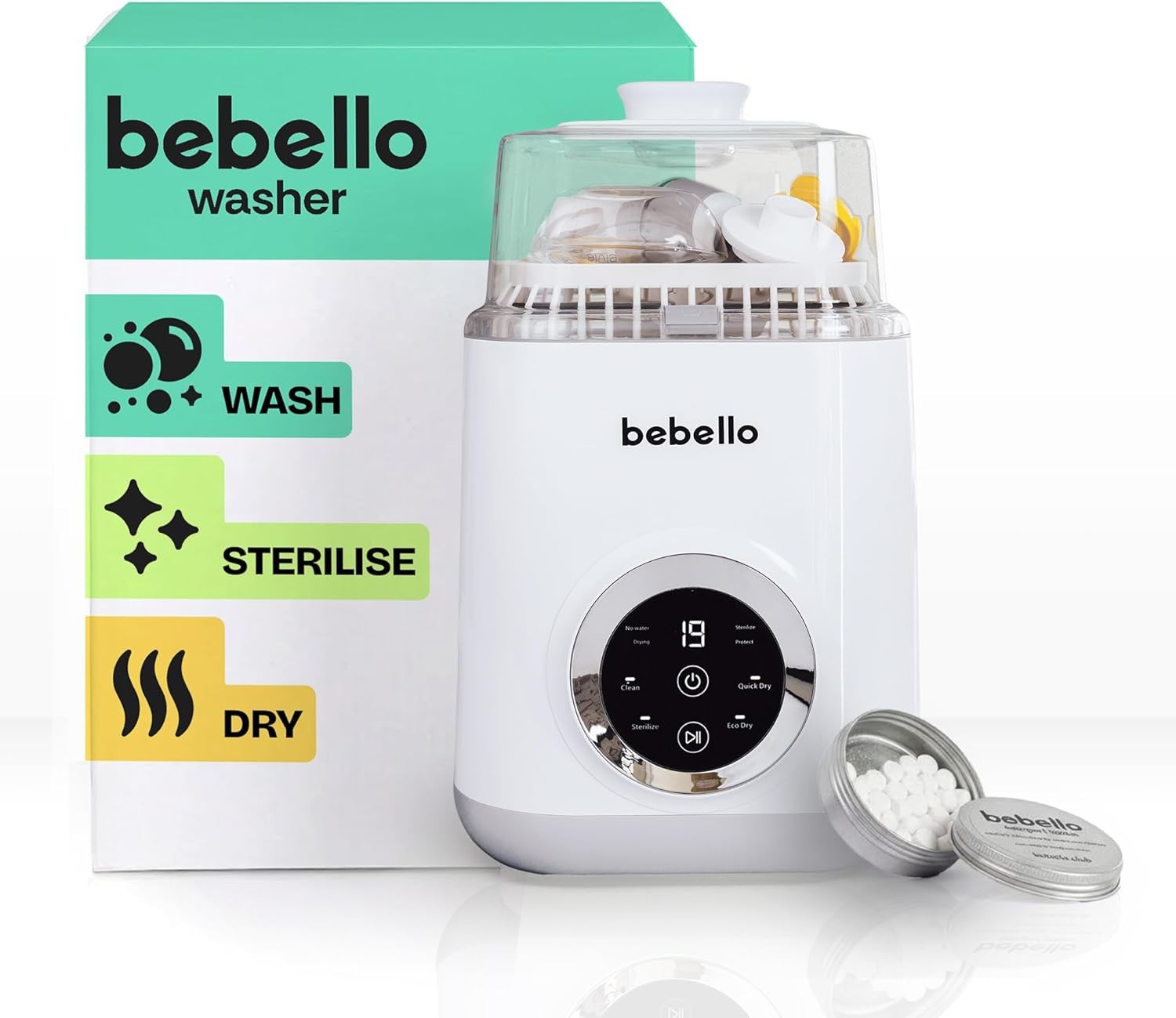 Bebello Washer - 4-in-1 Baby Bottle Washer, Steriliser, Dryer & Storage - Machine for Cleaning Bottles, Breast Pump Parts & Dummies - HEPA Filtration