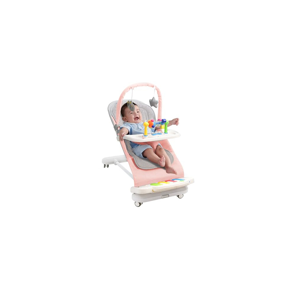 Baby Bouncer with Detachable Piano Toys, Baby Rocker with Feeding Tray, Removable Toy Bar, Thickened Cushion and Wheels. 4-Level Adjustable Bouncer C