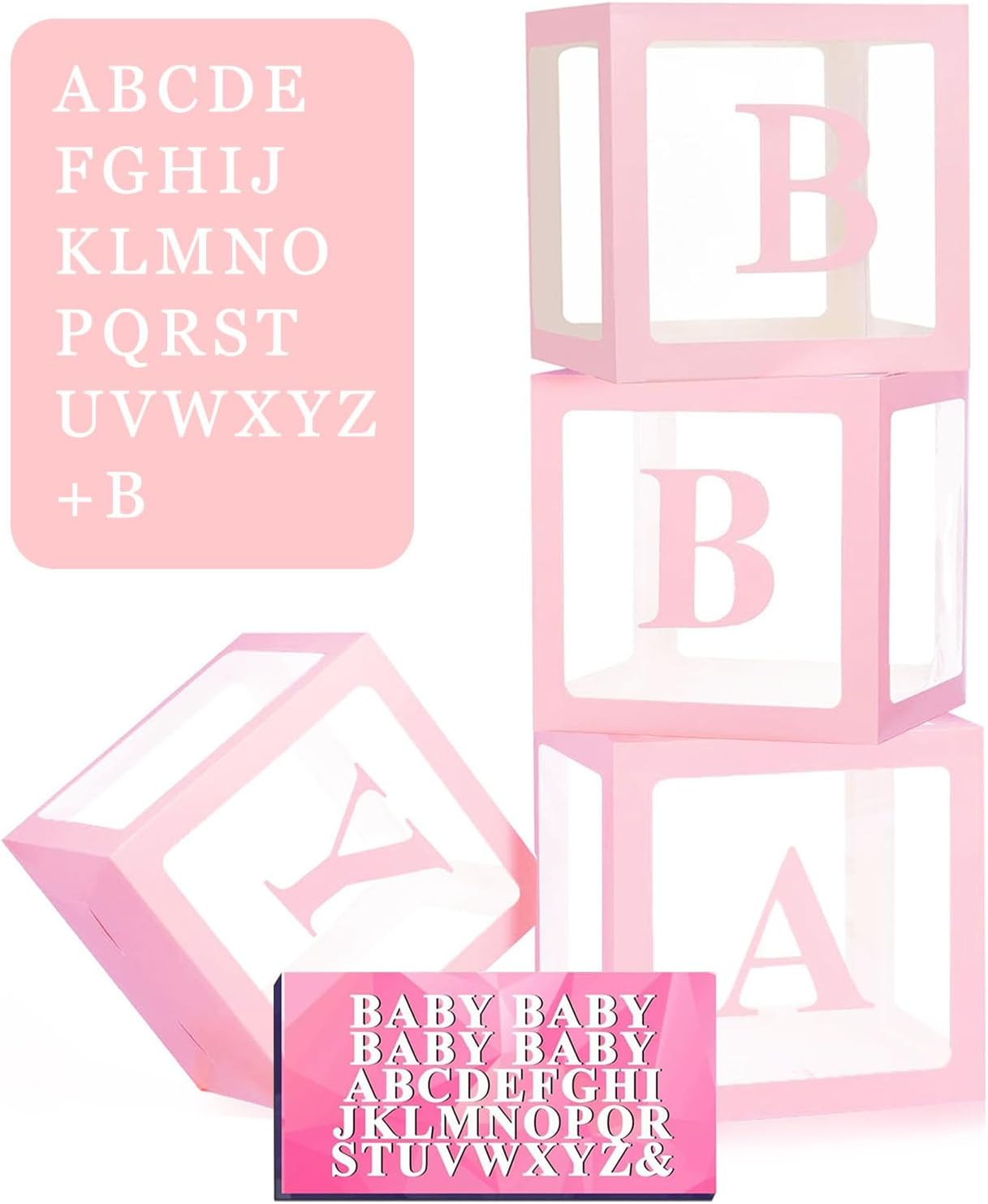 Balloon Boxes, 4PCS Baby Shower Decorations Boxes with 26 Letters A-Z, White Transparent Square Boxes with ‘BABY’ Letters for Boy Girl Baby Shower Birthday Theme Party Decoration (Pink)