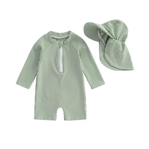 Geagodelia Newborn Baby Boy Swimming Costume with Sun Hat Long Sleeve Zip Up Swimsuit Sun Protection Swim Wetsuit Rash Guard Swimwear One Piece Bathing Suits (Striped Green, 6-12 Months)
