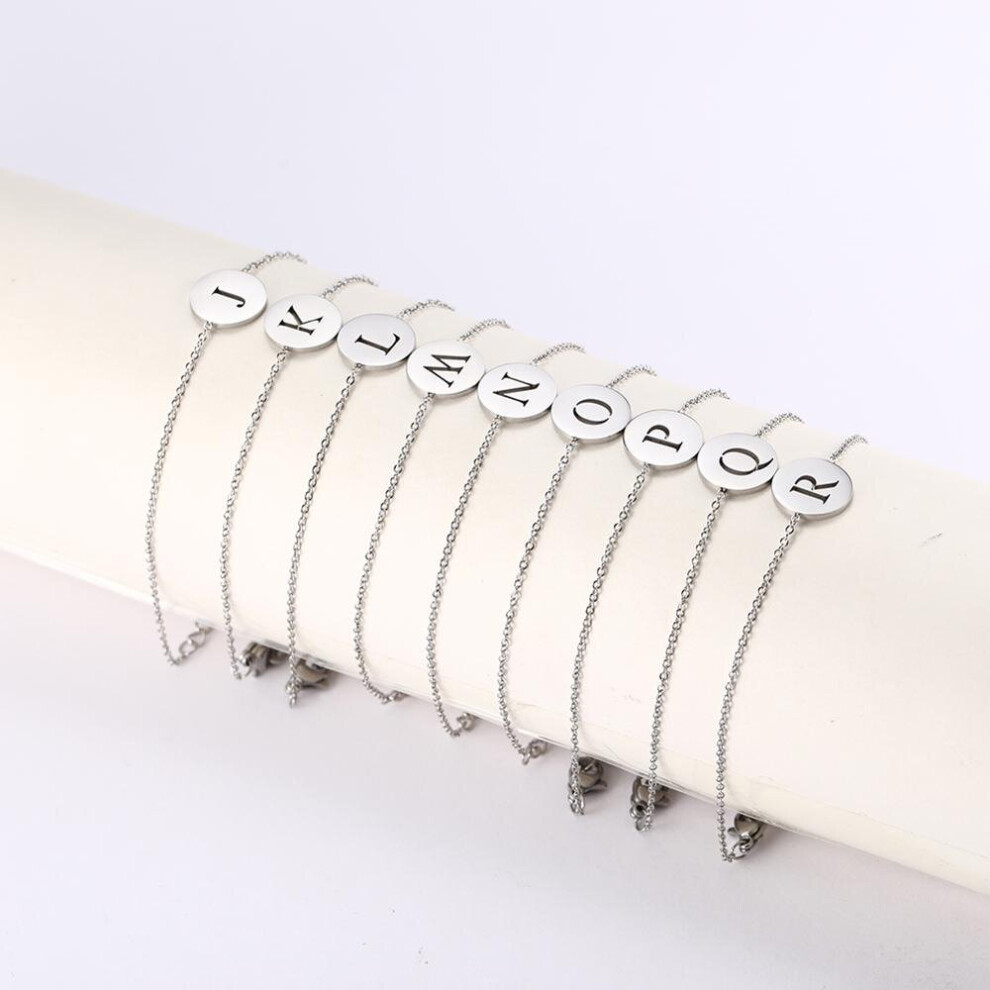 (Gold, 20.5cm) Cazador 26 Alphabet Initial Letters Bracelet Round Pendant Stainless Steel Bracelet for Women Kids Baby Jewelry